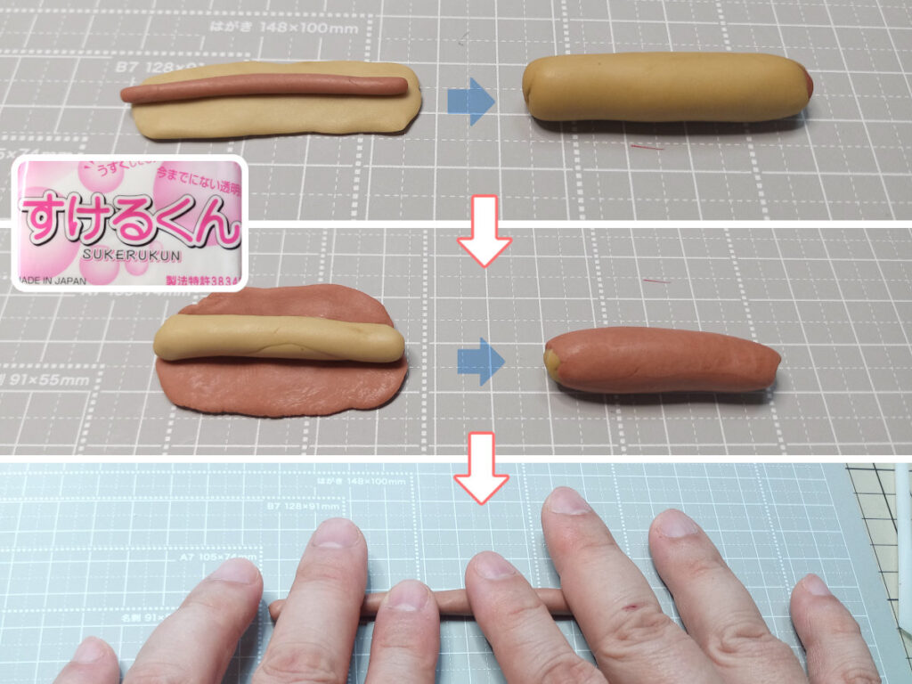 漬物の “染みた感じ” を出すのに、濃いめの色を芯に薄い色を巻き、さらに上から濃い色で巻いてコロコロ伸ばします。