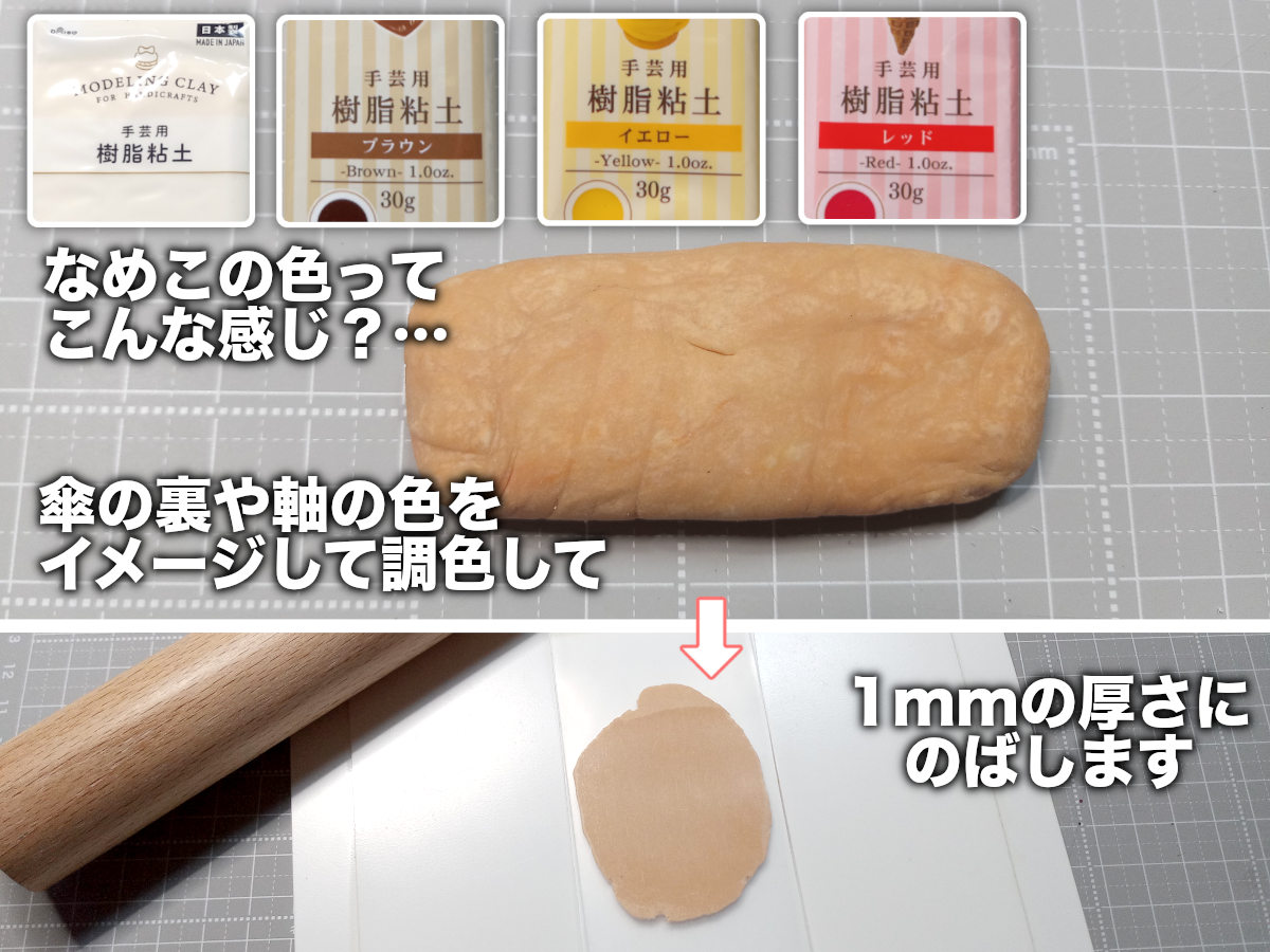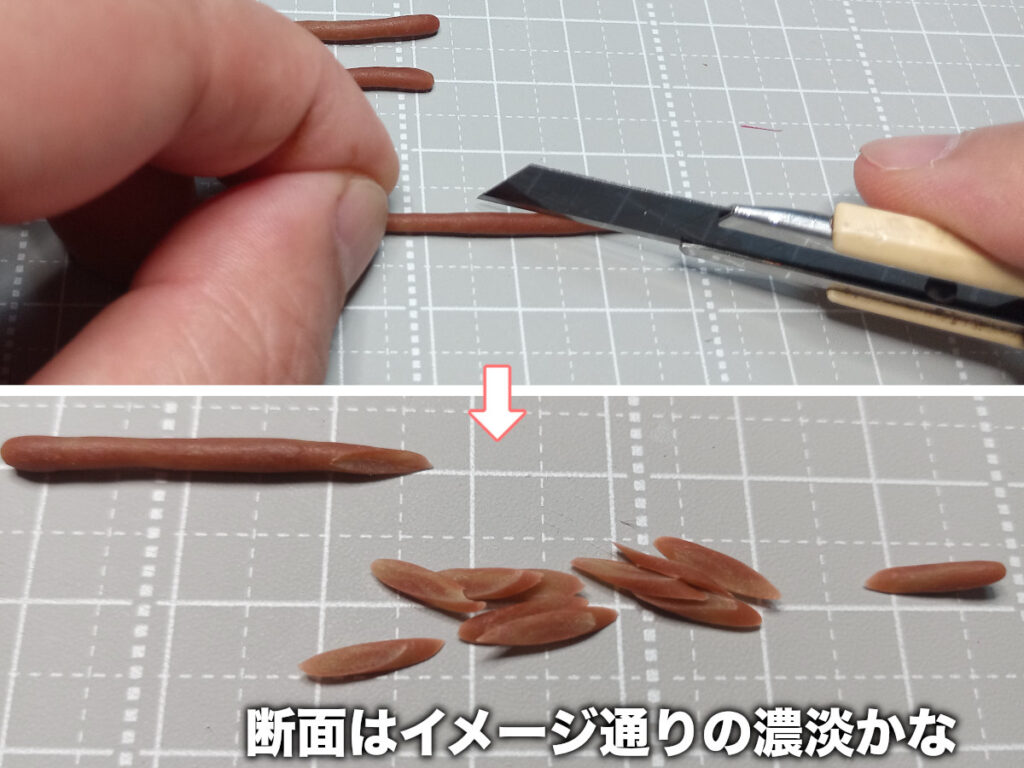 樹脂粘土でごぼうの濃い部分と薄い部分の2色を作って、それぞれに透明粘土「すけるくん」を50%ほど混ぜています。