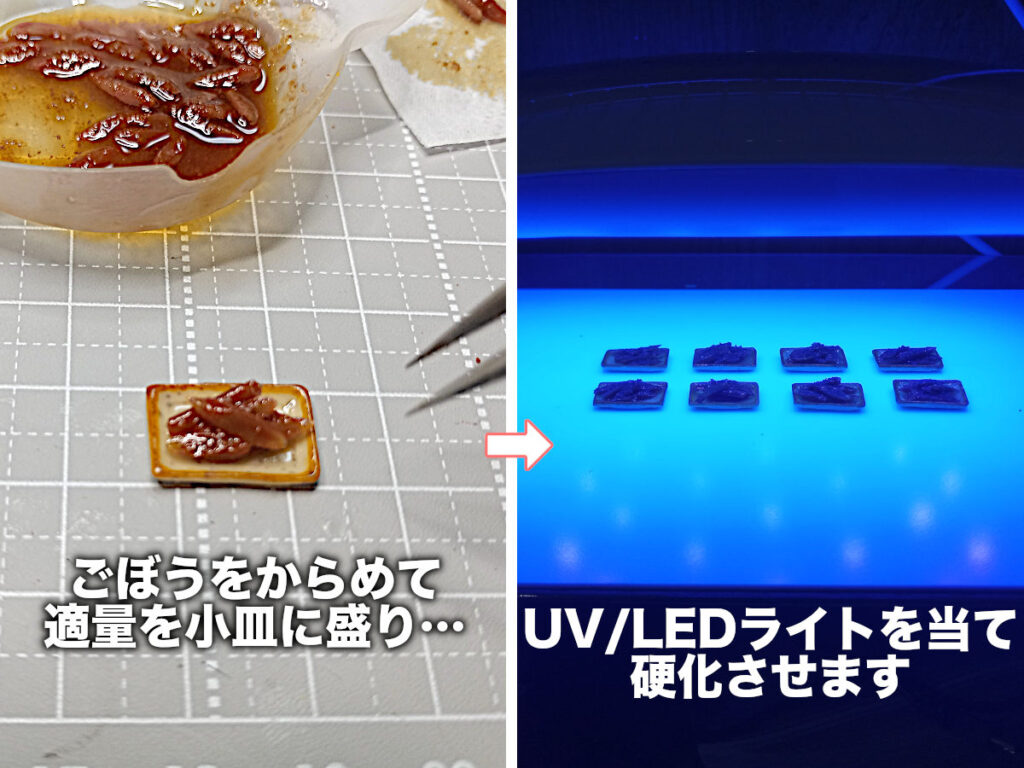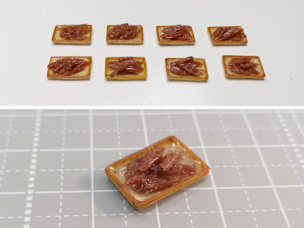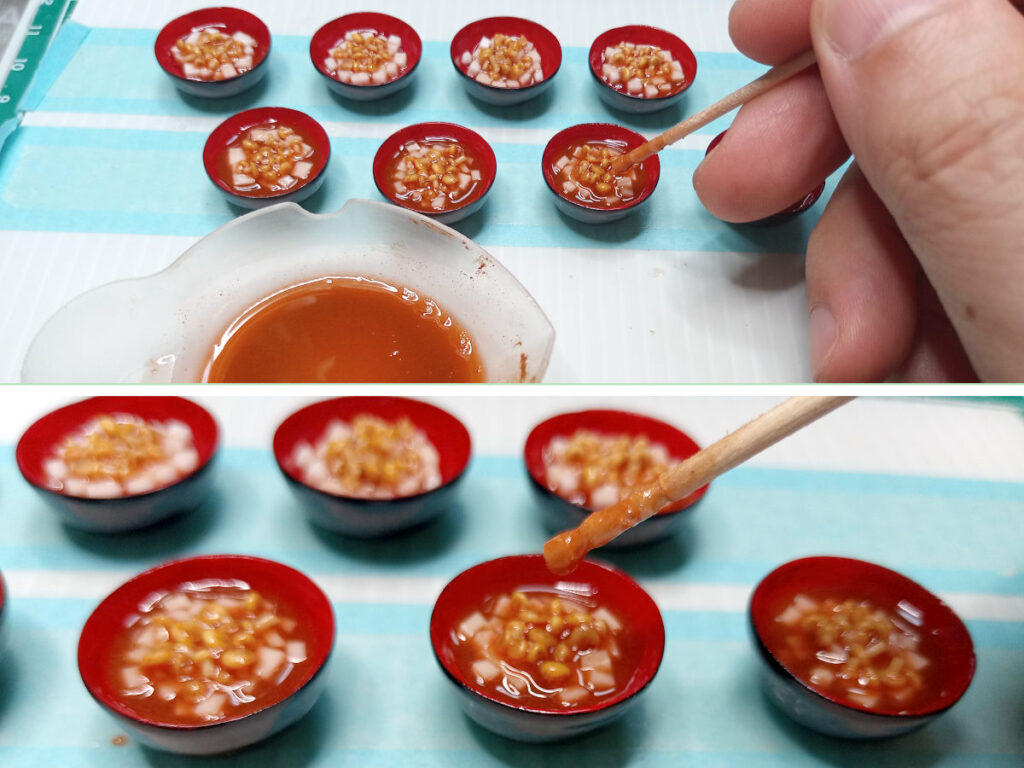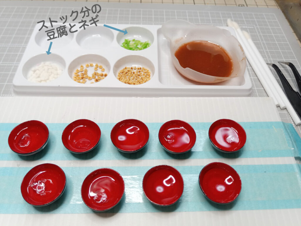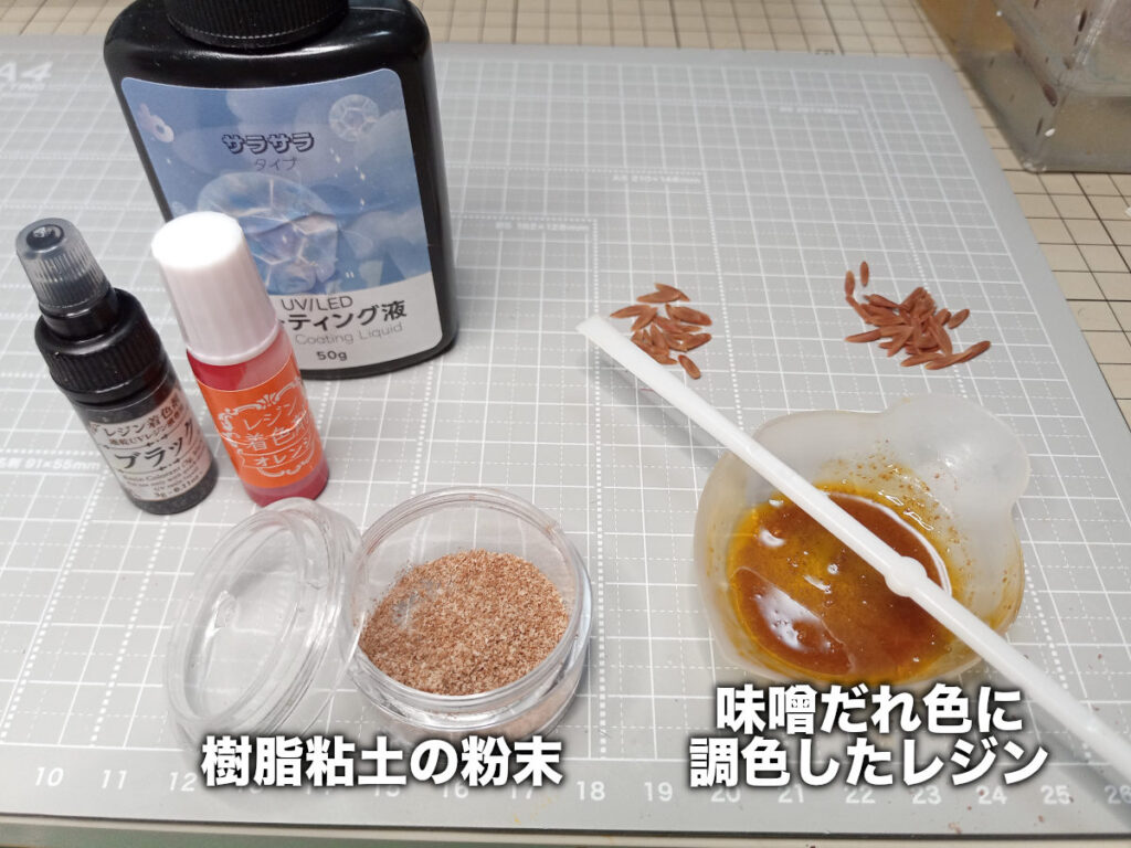 レジン用の着色液で味噌色を作って、レジンコーティング液に混ぜます。ザラつき感を出すために、ストックしておいた樹脂粘土の粉末(ミルで粉砕した残りカスなど)を味噌色レジンに混ぜます。この樹脂粘土の粉末は何の時のヤツだろう?… 色的にはハンバーグの粗挽き肉っぽいけどw