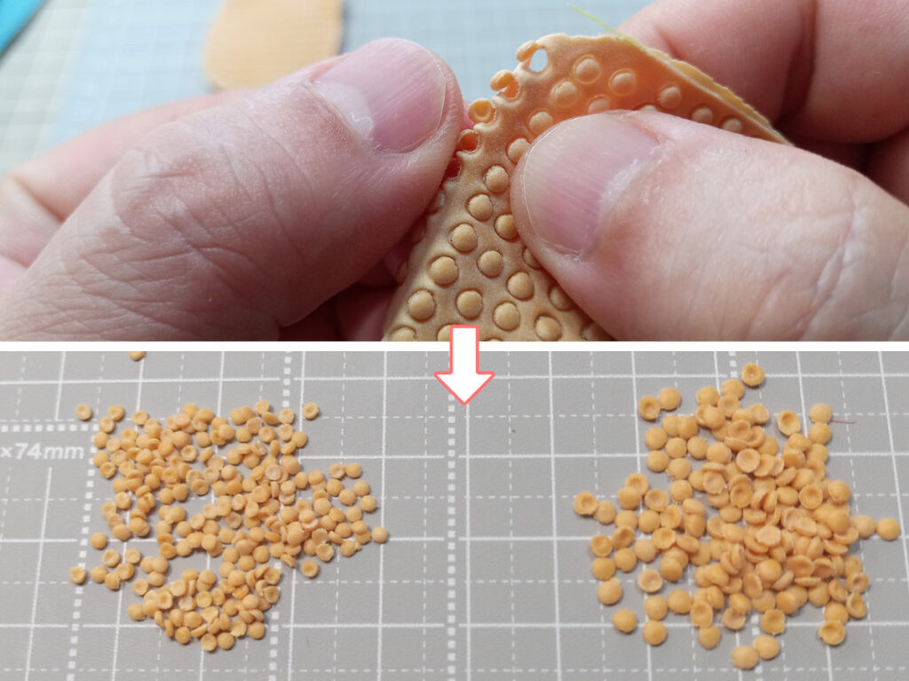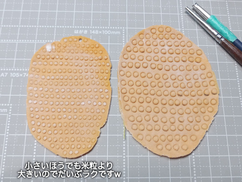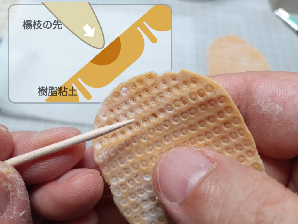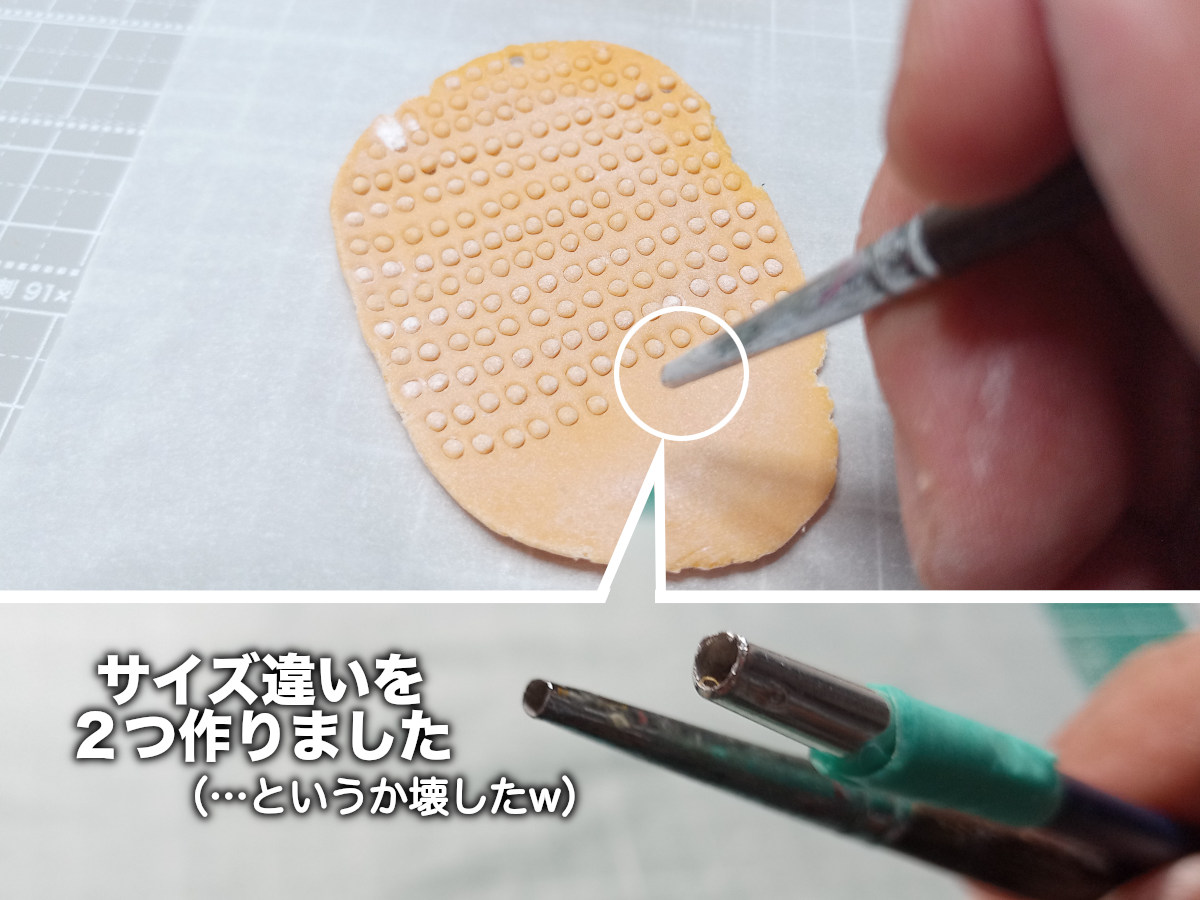 1mm厚にのばした樹脂粘土が乾く前に型押ししていきます。型押しの型は古くなった筆の先を引っこ抜いて作ります。