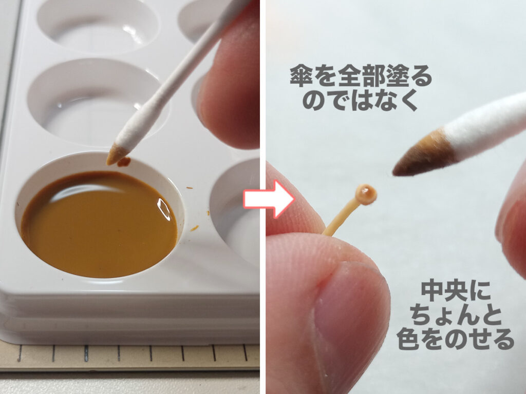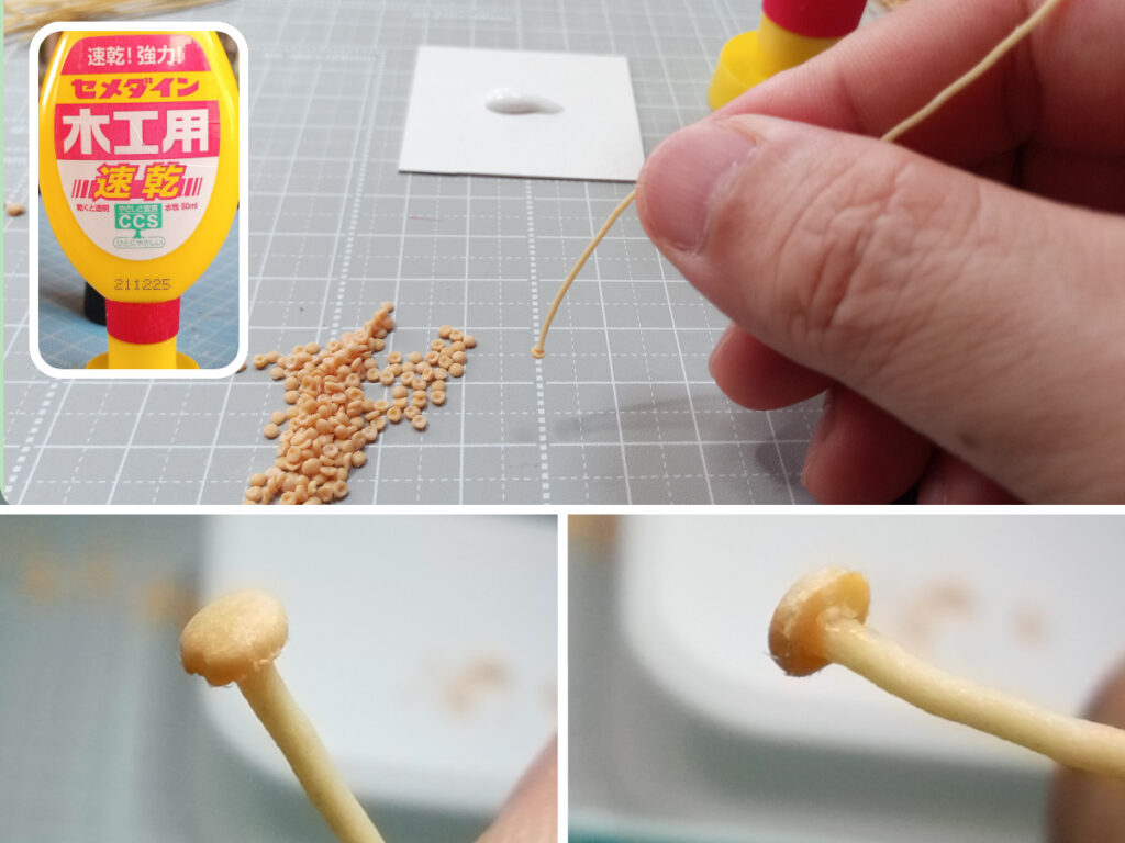 軸になる麺状の樹脂粘土の先っちょに、ちょんと木工用ボンドをつけて、なめこの傘の内側の窪みに当てると…