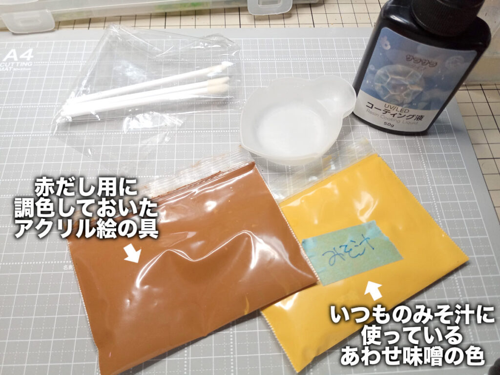みそ汁の表現は絵の具の調色もそうだけど、そのアクリル絵の具とレジンの混ぜる量のバランス。最近やっと(透け具合とか濁り具合とか)少しコントロール出来るようになってきた感じかも。