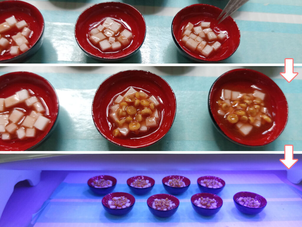 この段階でまず、なめこが崩れないよう、UV/LEDライトを当てて硬化させます。