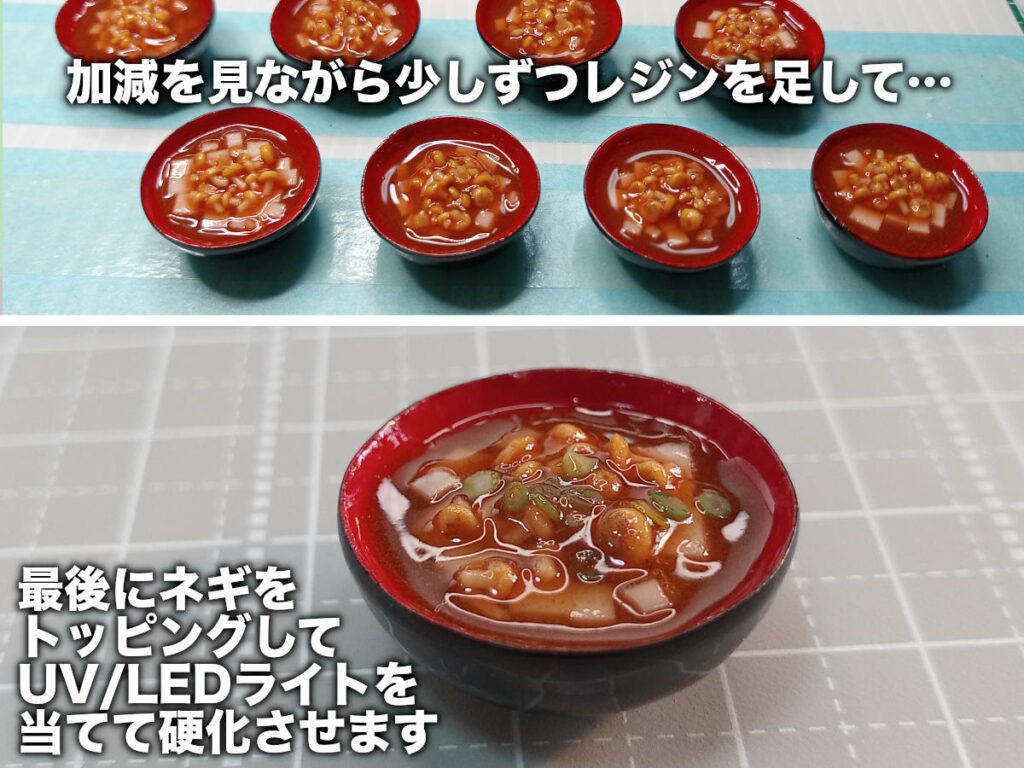 お椀に赤だしレジンを少し入れ、レジンを絡めた豆腐を敷き詰めるように並べ、なめこは中央に盛るようにのせます。