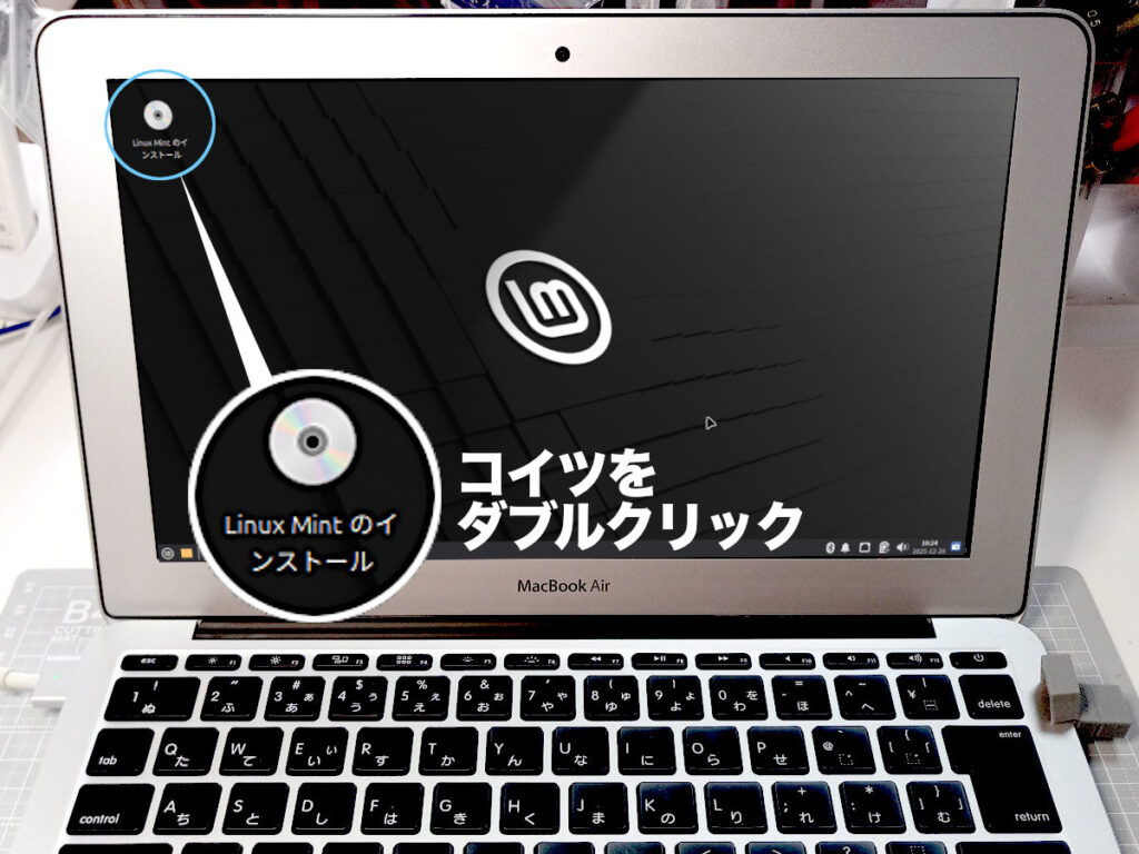 USB起動しているMintのデスクトップで:「Install Linux Mint」をダブルクリック