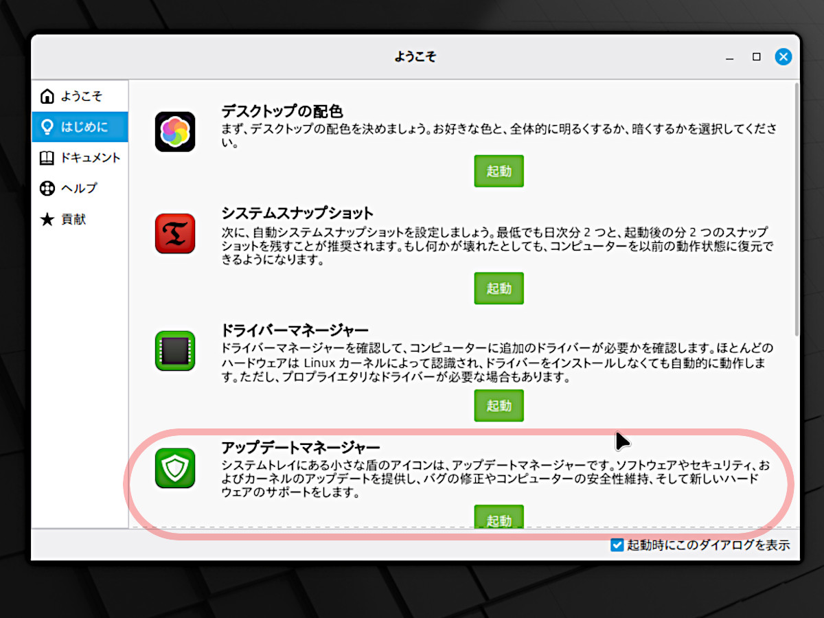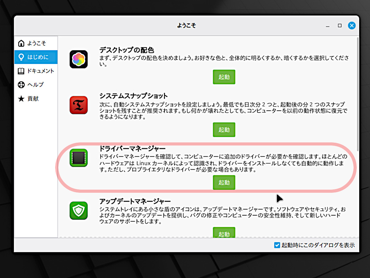 まずはドライバマネージャから、Wi-Fiをはじめ、各ドライバのインストール・アップデートを行って、MacのハードをLinuxでもちゃんと使えるようにしていく。
