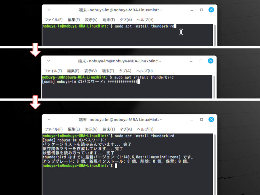 ターミナル開いたら、まず「sudo apt update」と打ち、Enter。 こうすることでアプリの最新版カタログを用意した状態(全然グラフィカルじゃないけどw)になって、欲しいアプリ(thunderbird)を2行目に「sudo apt install thunderbird」と打ち、次のターンでパスワードを入れるだけ。