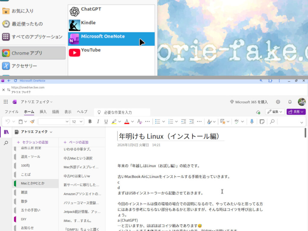 あと、文章のほうは いつもMicrosoftのOneNoteを使ってるのだけど、これのLinux版は存在しないので、代替アプリを使うか、Webページで開いたOneNoteを「ウェブアプリ」にして使うか?…という選択に迫られる。