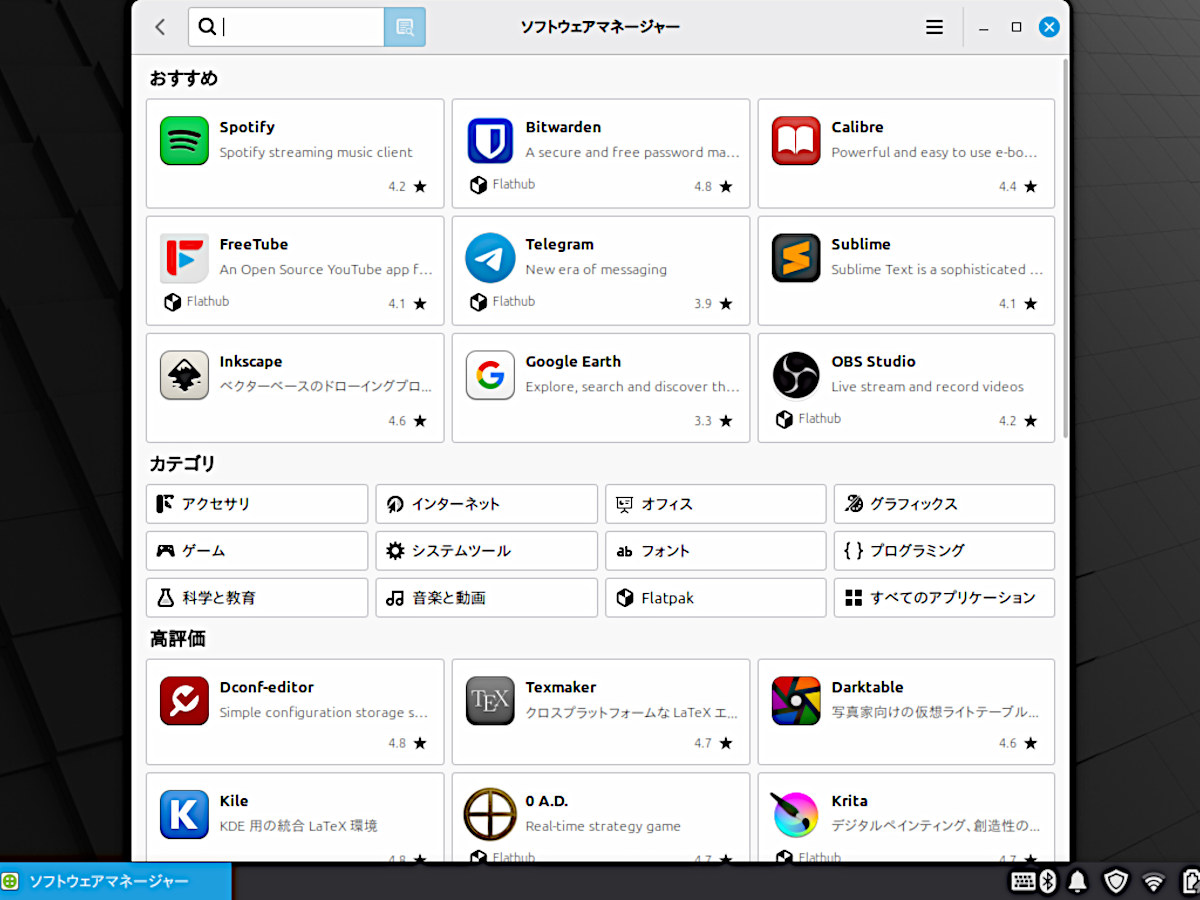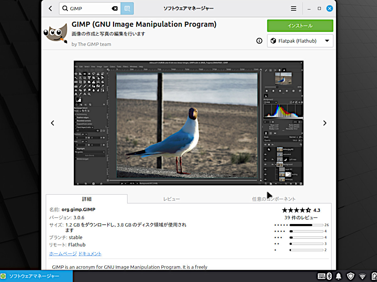 それと、このマシンの使用目的が一応「ブログ書き」なので、文章書き以外に簡単な写真加工もしたいのでGIMPをインストール。これは前回のUSBメモリからのライブ起動の際に動作確認済み。